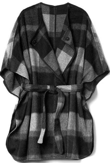 GAP Plaid Tie-Belt Poncho, $120: GAP’s mid-priced poncho coat makes an appearance with its darker shades of grey and wool blend fabric. The coat is detailed with short sleeves and a waist-cinching belt, for a more figure-flattering take on a classic flowing cape.