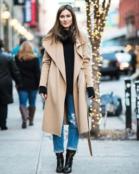 Turn to a camel coat: The look of a three quarter length camel coat can instantly transform your ripped boyfriend jeans into an elegant essential. Try layering your ensemble with a black knit turtleneck sweater and a pair of slouchy leather boots, for a truly winter ready outfit.