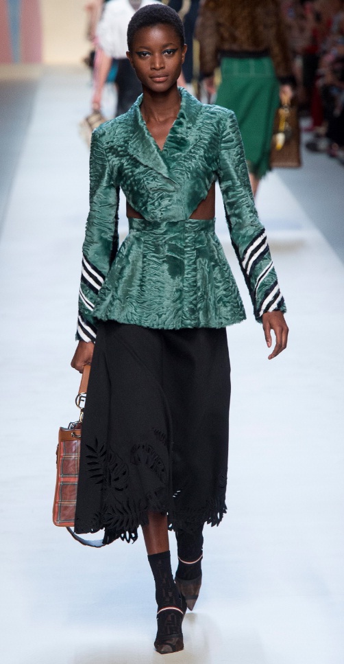 At Fendi, strategic side cut-outs helped to transform a teal crushed velvet blazer into a work of art. Meanwhile, a peplum bottom and contrasting black and white stripes on the sleeves completed the look. A black skirt with a cut-out motif on the hem brought a cool finish to the outfit, for a blazer look with definite sex appeal.