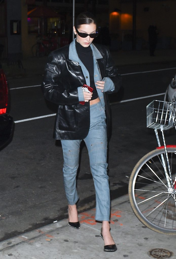 With its rebellious feel, it’s easy enough to bring an edge to your everyday leather. Nobody seems to embrace the retro inspired leather look quite like model Bella Hadid. The 21-year-old catwalk star pairs an oversized black leather blazer over a light blue denim jacket, black crop top and denim trousers. We are liking her studded flats and black sunglasses, for a chic and carefree model-off-duty vibe.