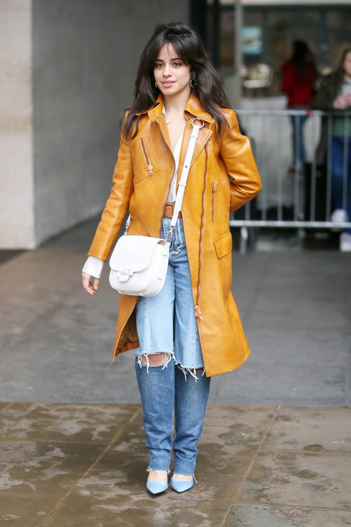 The 20-year-old Cuban American songstress may be making waves with her hit “Havana,” but she’s also earning a reputation for her sartorial sense. Our eyes are drawn to this particular street style look, and her ability to pair leather and denim effortlessly. Cabello’s mustard-coloured leather trench flatters her light wash torn jeans, while her white belt and matching mustard belt help to pull the outfit together. For a finishing touch, pale blue pointed toe shoes and a simple white crossbody bag balance out the vivid mustard shade of her coat.