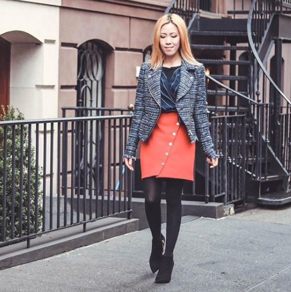 Special event: Whether it’s a cocktail party or a dinner with business associates, we all know that dressing up can be the key to a successful event! Try bringing a pop of colour to your usual work style in the form of a bright red buttoned skirt, as spotted in this Instagram look. Coordinate the scarlet statement piece with neutral black opaque tights, a navy blue blouse and a tweed blazer. Meanwhile, black wedge ankle boots help to give you a much-needed lift, and subtly lengthen your legs.