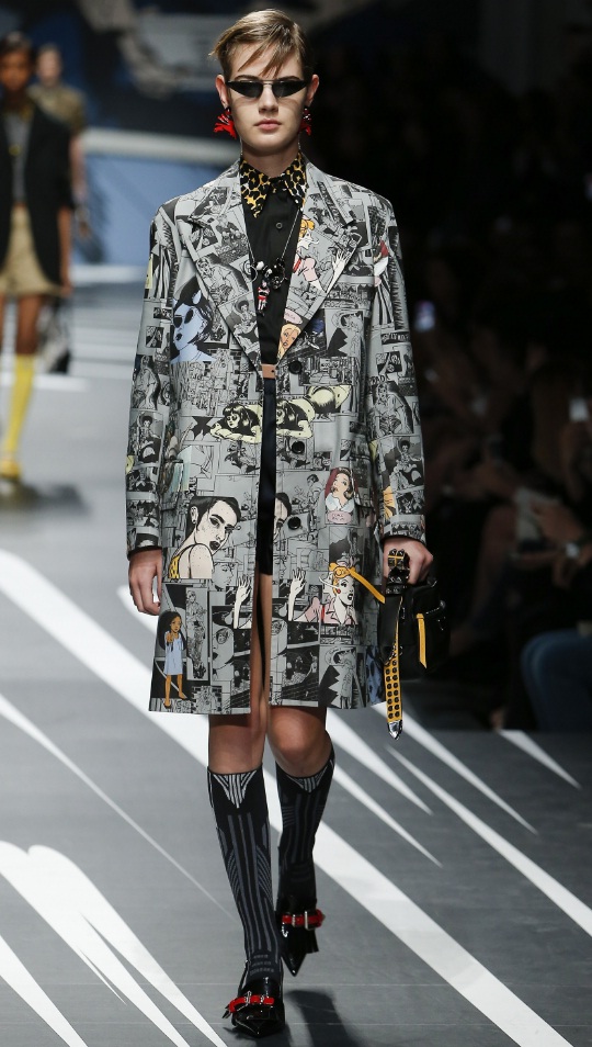 At Prada, a comic book theme dominated the runway, and brightened this knee-length grey coat. With a dark, broody aesthetic, an otherwise timeless jacket was transformed from a traditional topper to a work of art in itself. For the non-conformist who shies away from brighter shades and crazy sparkle, this was a reasonable way to rock the trend of artsy dressing.