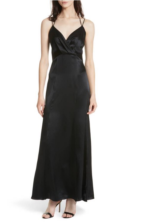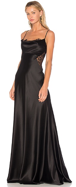 L’Agence Octavia Strappy Silk Charmeuse Gown, $777: This full-length black silk creation features princess seams, a ruched sweetheart bodice and tiny thin straps. For anyone wanting to make a dramatic statement, this slinky frock may be your style solution for an evening function.