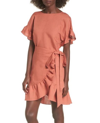 ASTR THE LABEL Ruffle Linen Blend Wrap Dress, $93: Ruffles seem to be back in a major way for Spring 2018, but can look just as suitable for your family gathering as they do on the runways. This coral-coloured linen wrap dress defines the waistline and is finished off with a ribbon tie for a girlish, spring-ready feel.