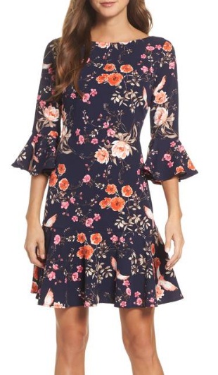 Eliza J Bell Sleeve Flounce Dress, $186: We are liking this navy blue dress, which makes a statement with its sweet flutter sleeves and its splashy floral print. The soft orange and pink blossoms help to liven up the dress, while the conservative sleeves and hemline make it appropriate for dinner with Grandma.