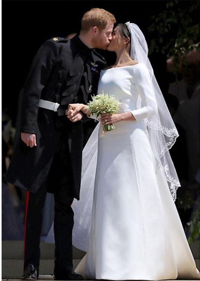 This morning, the luxury French fashion house posted two photos on Instagram of Markle wearing the dress. One features the beautiful bride sharing a kiss with the 33-year-old prince, in which she clutches a bouquet of white flowers. Markle’s long, sheer white 16 foot veil was adorned with a lacy trim, while the Givenchy gown featured a modest boat neckline and ladylike three-quarter sleeves. Meanwhile, the defined waistline, pleated, structured hem and flowing train completed the overall design.