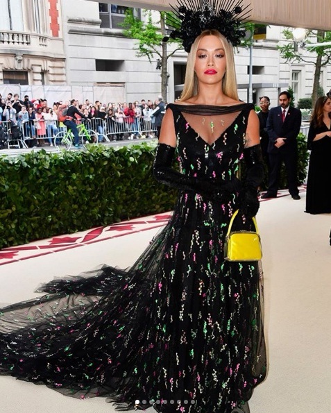 The 27-year-old British songstress wore a black Prada number, which highlighted her evolving and maturing style. Ora’s outfit of the night featured an airy, sheer hem, illusion V-neckline and a vibrant flowery print. She wrapped up her Met Gala ensemble with a pair of elegant, long black gloves, a contrasting neon yellow micro handbag and an eye-catching black headpiece.
