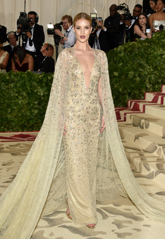 The 31-year-old English supermodel usually makes a statement with her model-off-duty looks, and is known for her casual yet chic silhouettes away from the runway. Last night, the beautiful blonde played up her glamorous side, and wore glimmering gold metallic Ralph Lauren Collection gown with a deep V-neck. The dress was accented with a trailing cape, for a chic effect. We also like Huntington-Whiteley’s gold halo-like hair ornament, which plays up the angelic, glowing nature of her look.