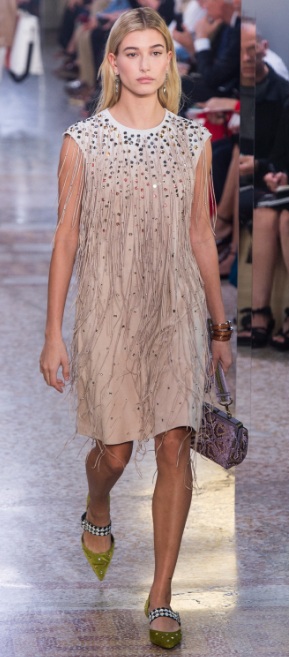 Model Hailey Baldwin rocked this Bottega Veneta number on the catwalks, and we can certainly see why. With its shift dress style, embellished bodice and strands of dangling blush fringe, the dress makes a loud and proud statement. For a finishing touch, Baldwin pairs this bohemian chic frock with pointed toe flats and a ladylike handbag.