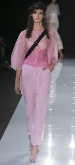 Meanwhile, Emporio Armani rocked the look in the form of a candy pink sheer blouse with puffed, three quarter sleeves. Styled with a bandeau top and a pair of soft pink pleated trousers, this look was a more conservative take on the typically risqué look of sheer. We are liking the matching strappy sandals, black beret and crossbody bag, which add a dose of femininity.