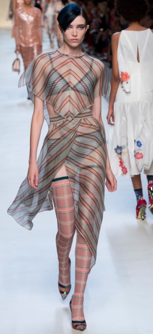 At Fendi, the sheer midi dress made an appearance adorned with subtle, sweet stripes. With its transparent fabric and contrasting, soft stripes in shades of orange and red, this airy dress steals the catwalk. We are loving the short flutter sleeves on this frock, as well as the cut-out sides on the bodice.