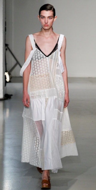 At Joseph, the sheer white dress was a major look. Perfect for a weekend afternoon, the sleeveless dress featured thick straps, a V-neckline and white eyelet lace. The sheer panels and the lacy black cami underneath offer a hint of sex appeal, and help to balance out the feminine silhouette on display.