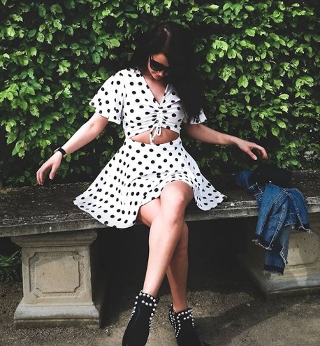 Polka dots: As spotted in this Instagram outfit, this black and white ruched dress has a retro vibe to it. With its V-neckline, cut-out midsection and short flared skirt, this polka dot printed frock seizes attention and features a girlish silhouette.