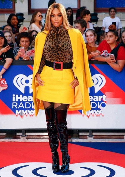 The timeless fashion icon looked radiant in yellow, as she graced the iHeartRadio MMVAs red carpet wearing a bright, sunny miniskirt styled with a leopard print top and a matching yellow oversized coat. For a finishing touch, Banks wrapped up her overall ensemble with a wide, waist-defining black belt and a pair of sleek thigh-high boots.