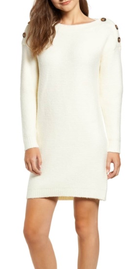 Chriselle Lim Collection Sawyer Sweater Dress, $116: The white sweater dress makes a major statement this season, in the form of an above-the-knee knit frock with long sleeves. The cream colour, buttons and loose-fitting silhouette help to complete the overall look.