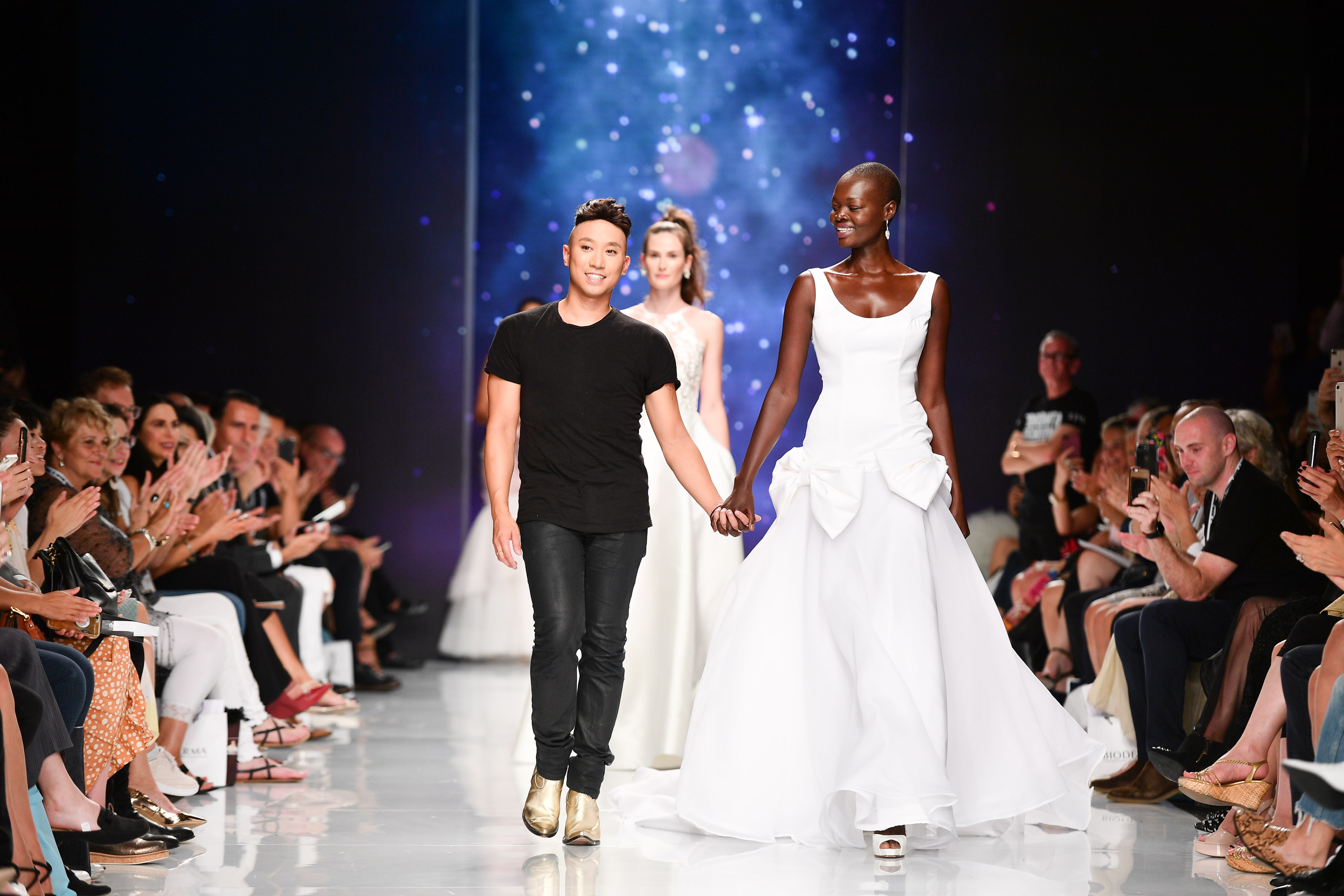The Canadian eveningwear designer partnered up with sponsor Herman-Sellers-Gough Furs to present a new collection of both evening gowns and bridalwear. On the bridal front, Paunil stayed true to tradition, with voluminous ivory gowns, strapless necklines and the occasional V-neckline. Meanwhile, eveningwear verged into more daring territory, with pops of vivid yellow, black and white houndstooth prints and a dramatic, iridescent gown which channelled mermaid vibes.