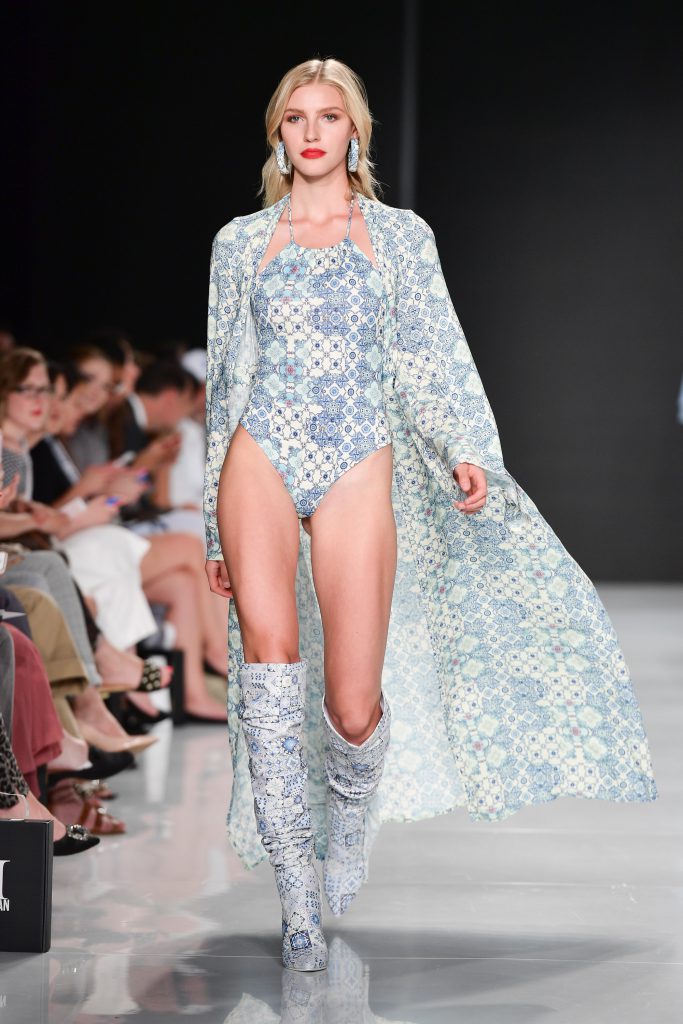 Toronto womenswear designer Hilary MacMillan also emphasized femininity for Spring 2019, with her punchy collection of pastel blue and pink prints. Models walked the runway wearing powder blue in all variations, from a slip dress to structured blazers and flowing trousers. Meanwhile, peasant tunics and frocks with a blue and white bohemian motif were a statement look. The bohemian vibes continued, in the form of a signature red and print paisley print on coat dresses, sleeveless belted dresses and cropped trousers.