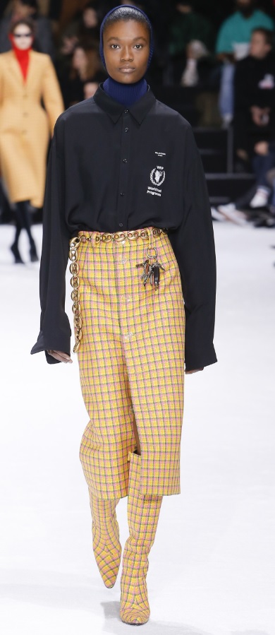 Balenciaga brought a slightly more contemporary spin to yellow plaid, with the addition of a three-quarter length skirt with a thigh-high skirt and matching boots. The entire outfit was finished with a metallic chain belt and a button-down black dress shirt.