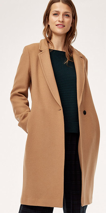 Aritzia Babaton Stedman Coat, $249: This mid-length, wool-cashmere blend coat in a camel shade keeps the look matchy-matchy. The first order of business…snag one just like it. Second order of business…wait for the compliments.