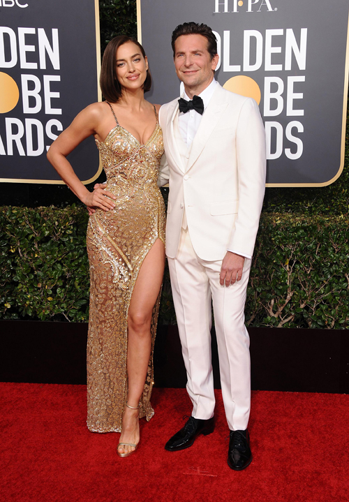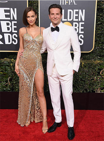 Supermodel Irina Shayk looked like a golden goddess for the Globes in Versace. The sweetheart neckline and thigh-high leg slit are certainly figure flattering and accessorizing with Bradley Cooper is always a good idea.