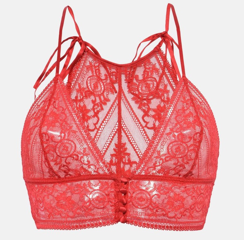 Dynamite Halter Bodysuit, $37 & Lace Kimono, $40: This lacy, red bodysuit (and matching kimono) is in the undeniable colour of love. The plunging neckline and thong back, leave little to the imagination, but sometimes that’s the point.