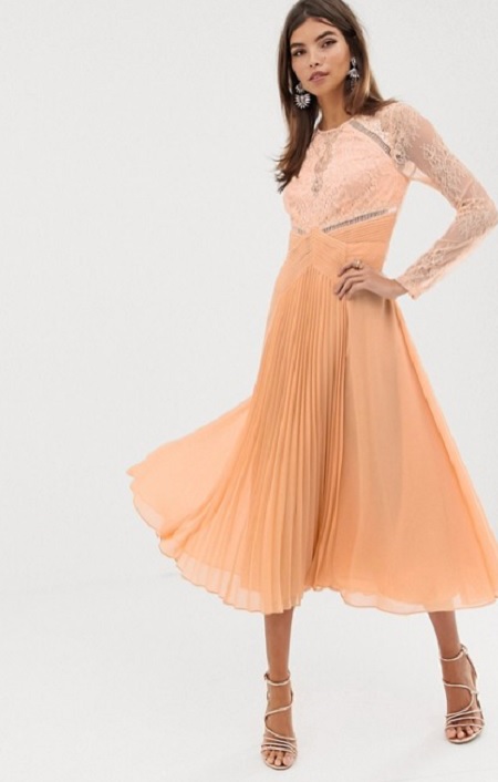 ASOS DESIGN Long Sleeve Lace Panelled Pleat Midi Dress, $158: The pleated skirt of this peach hued dress is ready for twirling on the dance floor (and we say, “YES!” to the long sleeves!).