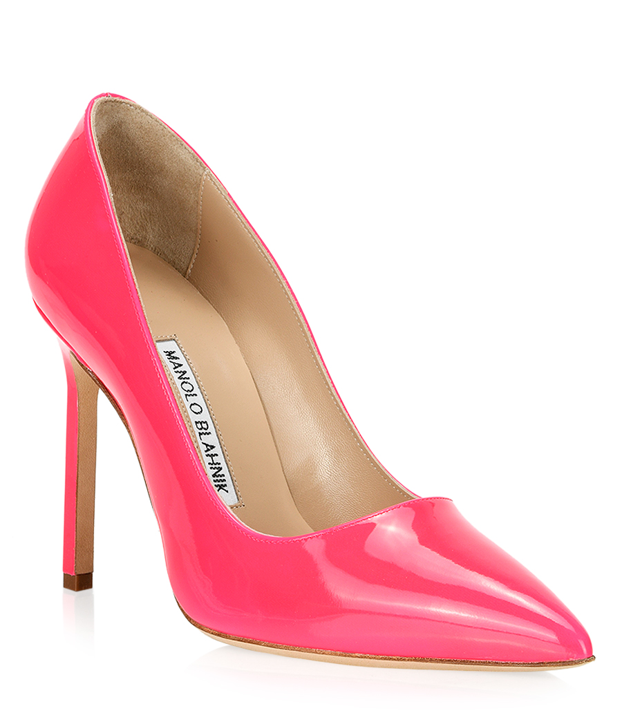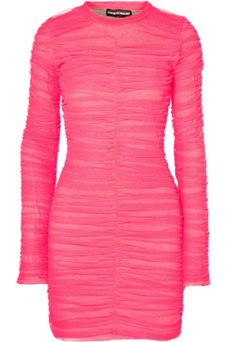 House of Holland Ruched Tulle and Stretch-Cotton Jersey Mini Dress, $505, & Manolo Blahnik patent leather pump in Pink, $795: Ruched tulle detailing plus long sleeves equals dressed-up dreams…and that’s even before adding the classic, popsicle pink (and Barbie-approved), Manolo pumps.
