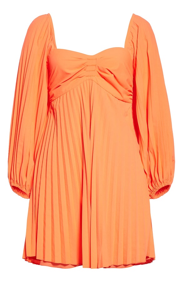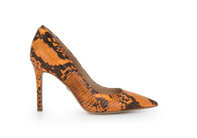 A.L.C. Lincoln Long Sleeve Dress in Neon Orange, $840, & Sam Edelman Hazel Pointed Toe Heel, $198: This babydoll dress has adorable design details with its sweetheart neckline, pleated skirt, and open back. It’s the perfect girly contrast to these badass snakeskin pumps.