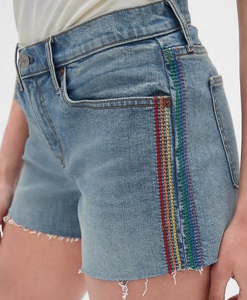 Gap + Pride Mid Rise 3″ Embroidered Denim Shorts, $69.95: The rainbow stripe embroidery that runs down the side of these frayed hem shorts, delivers a more subtle pop of colour. Bonus: until July 6, Gap will give 15% of the sales from their Pride pieces to the UN Free & Equal Campaign.