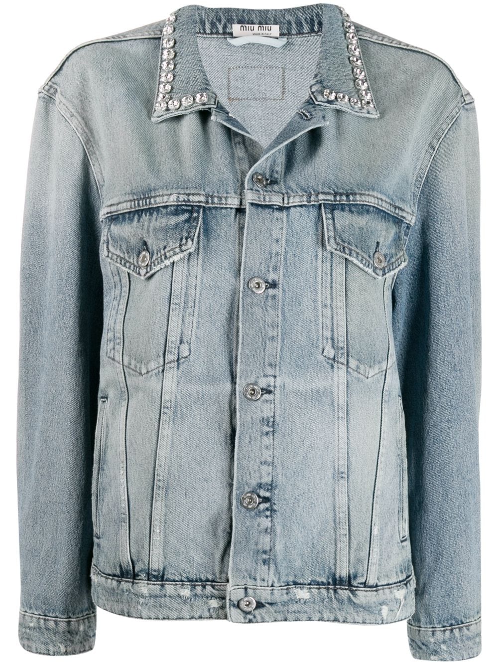 Miu Miu Oversized Denim Jacket, $1890: Looking to dabble in the trend, but don’t want to commit too heavily to the cause? This pick leaves the gemstones on the collar, for just a touch of bling.