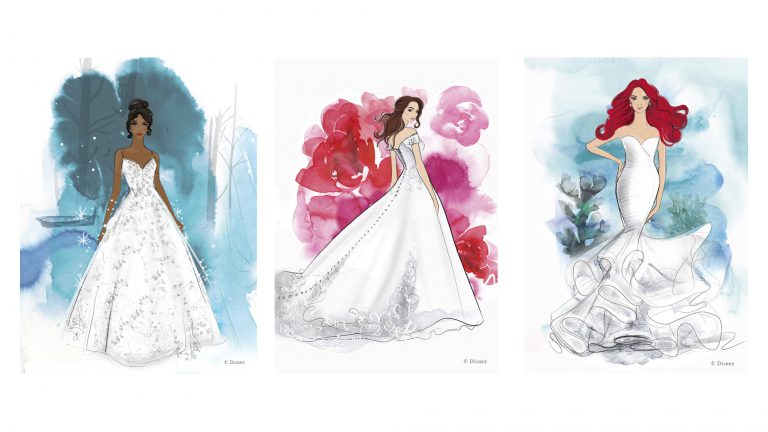 The elegant collection features 16 gowns inspired by the style and spirit of Disney Princess characters such as Ariel, Aurora, Belle, Jasmine, Cinderella, Pocahontas, Rapunzel, Tiana and Snow White.