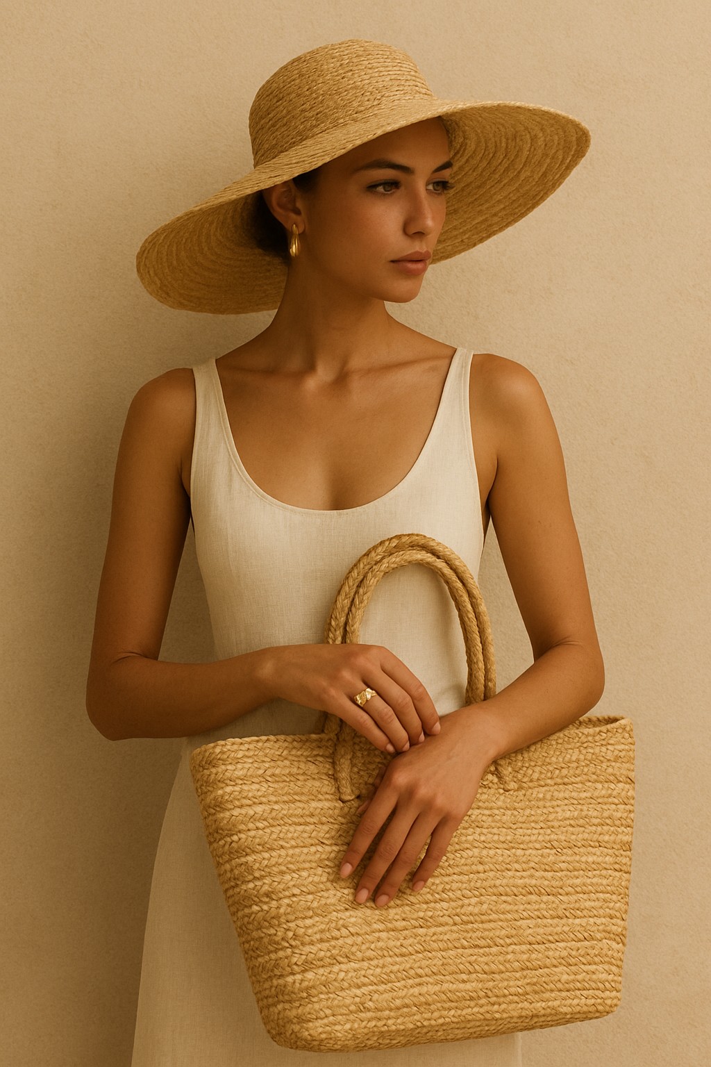 Accessories this season revolve around texture. Raffia bags continue to dominate, led by Loewe’s iconic straw totes and Bottega Veneta’s sculptural woven styles. Oversized sun hats—especially those dramatic, floppy silhouettes—instantly create a polished, editorial-worthy resort look.