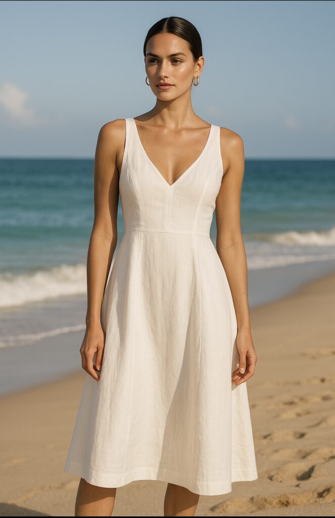 The white dress remains the defining staple of resort dressing. Chloé offers airy linen sheaths with subtle corsetry, while Zimmermann leans into embroidered cotton sundresses. Clean necklines, soft volume, and architectural pleats make these dresses the modern alternative to kaftans, instantly polished and endlessly photogenic.