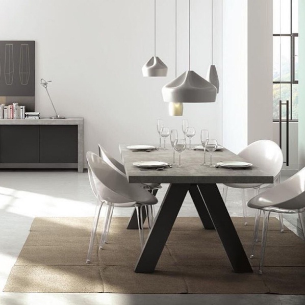 Create a stylish space with a modern grey concrete dining table: This season, dine in style with a slate grey dining table made of concrete. Use sleek and modern white chairs, a beige area rug and dangling white chandeliers to flatter your neutral interior design look. If you’re entertaining guests, use white ceramic plates to instantly lend a striking touch to your concrete table.