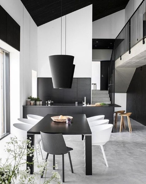 Infuse your kitchen space with black and white hues: For a gorgeous neutral statement, turn to a combination of black and white in your kitchen or dining room. The look of a polished black wooden table, modern white seats and hanging black lamps instantly completes your interior design. Meanwhile, black and white accent walls and edgy black countertops can instantly wrap up your space.