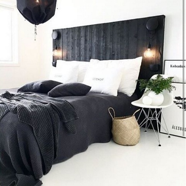 Bring basic black bedding into your bedroom: You may be used to airy white hues in your chamber, but bedroom décor receives an immediate boost in the form of black throw blankets and sheets. Contrast the darker hues with fluffy white pillows, ivory painted walls and a woven wicker basket.