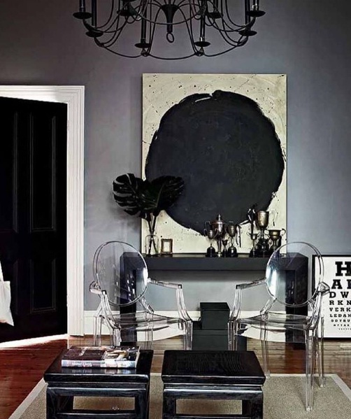 Turn to black wooden coffee tables and a decorative chandelier: If you’re aiming for a darkly sleek living room, try adorning your space with a black painted door and inky wooden coffee tables. To accessorize the basic black, turn to an ornate black chandelier, black wall art and gleaming hardwood floors.