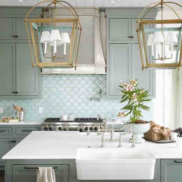Turn to pale blue kitchen tiles and grey cabinetry: Fish scale tiles look equally as at home in a kitchen surrounded by light neutral tiles and dangling gold chandeliers. Look for funky modern lighting, along with a slate grey colour scheme and stainless steel accents.
