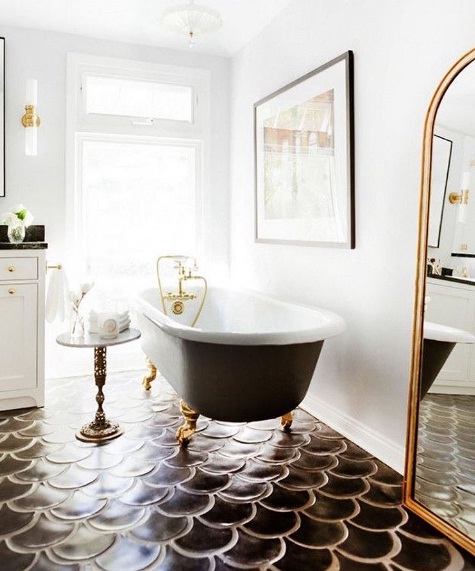 Refresh your bathroom with dark brown tiles and a claw bathtub: If your bathroom is crying out for an upgrade, turn to large fish scale tiles in a chocolate brown hue. These can be used to bring your bathroom flooring to a new level. Meanwhile, a vintage inspired white and brown tub with gleaming gold hardware offers a sophisticated finish. To flatter your interior design, stick to ivory walls, metallic mirrors and sleek white cabinetry.