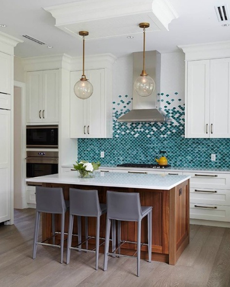 Update your kitchen with an aquamarine-coloured and white backsplash: While fish scale tiles can be perfectly suitable for your bathroom décor, incorporating fish scale tiles into your kitchen backsplash can be a chic move. Turn to turquoise, aquamarine and white scales for an elegant space. Finish off your décor with brilliant white cabinets, pale hardwood flooring and gleaming white countertops.