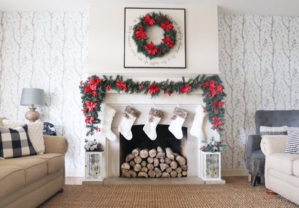 Use woodsy accents for a rustic effect: After all, there’s no hard rule that a holiday fireplace must be festooned with brilliant twinkling lights. If the great outdoors are your biggest design inspiration, bring new life to your space with a traditional reclaimed wood fireplace. Meanwhile, a wreath made with slender branches can help to accessorize your mantel in style.