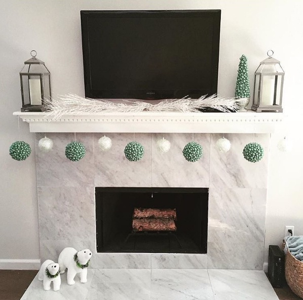 Turn to simplicity with shades of ivory and emerald green: If you prefer understated elegance to the full-on razzle dazzle of the holidays, stick to a classic ivory marble fireplace. Decorate your mantel with white feathers or tinsel, and use dangling white and green ornaments for a finishing touch.