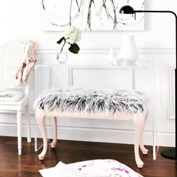 Introduce a furry grey bench to your space: Soft and subtle grey furs can look just as luxurious at home, and can help to instantly add comfort to your room. We are loving the idea of a fluffy grey bench, placed in either a living room or study. Complete the look with gleaming polished hardwood floors, a white wooden chair and a dainty ivory porcelain vase.