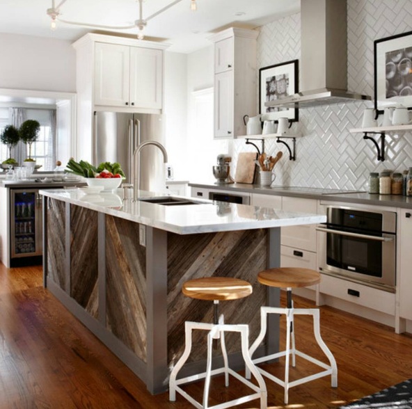 Turn to rustic wood and white quartz for a stylish combination: For anyone craving an instant kitchen makeover this season, try upgrading your space with sleek wooden stools. Meanwhile, white quartz countertops, ivory-painted cabinets and gleaming silver appliances keep your entire kitchen looking modern and sleek.