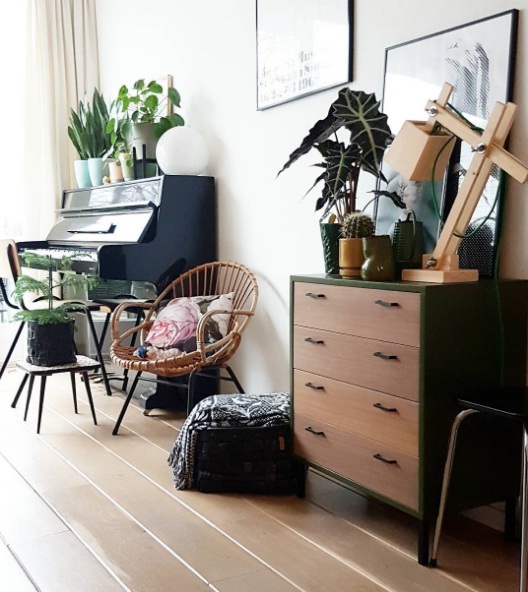 Use a wooden chest-of-drawers as a statement piece in your bedroom: With the practical chest-of-drawers playing a vital role in vintage design, no mid-century modern bedroom is complete without this touch. Woods pairs well with darker shades of green, hardwood flooring and quaint wicker furniture.