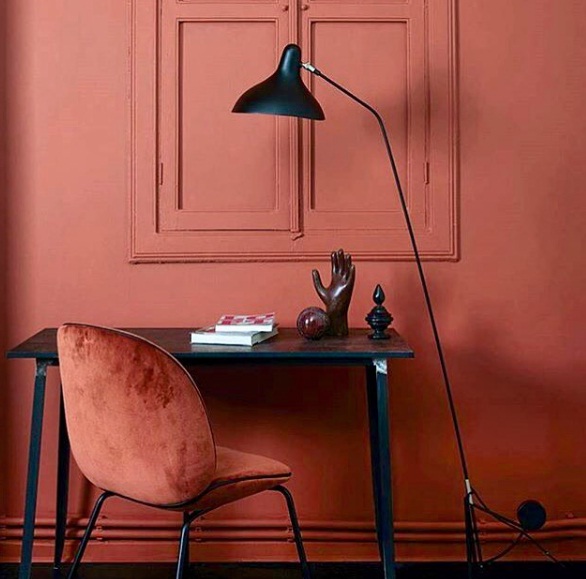 Decorate with earthy tones, slender desks and plush seating: Since shades of brown and various peachy hues are so prevalent in mid-century design, try incorporating this colour scheme into your home office. Try painting an accent wall in a rich terracotta shade, and adding a plush velvet chair in a matching hue. Meanwhile, a sleek wooden office desk in an inky black flatters your décor, while a funky desk lamp offers a contemporary effect.