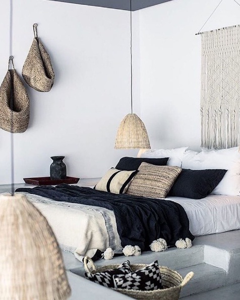 Turn to rustic elements for a dose of bohemian chic: After all, there’s nothing quite like funky boho accents to usher serenity and peace into your humble abode. Hang a woven pendant lamp above your bed, and use black and white linens for a cool, chic touch. To complete the rustic look of your space, woven wall tapestries, wicker baskets and clay vases transport an ordinary urban dwelling into a bohemian paradise.