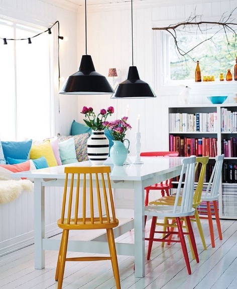 Turn to colourful furnishings and sleek, modern lighting: For a contrasting combination of edgy accents and bold hues, combine the traditional industrial setting with modernized, youthful pieces. The look of multicoloured wooden chairs and rainbow accent pillows can be juxtaposed against hanging black pendant lamps, for the best of both worlds.