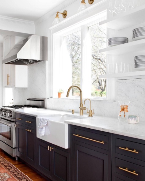 Use gleaming gold finishes for the ultimate effect: If you’re wondering how to step into the trend, pops of gold can revitalize your kitchen, without the need for a room full of metals. Turn to shining gold faucets and matching gold hardware on cabinets to bring your space to life. Meanwhile, white marble countertops, black painted cabinetry and ivory shelves allow the gold fixtures to shine.